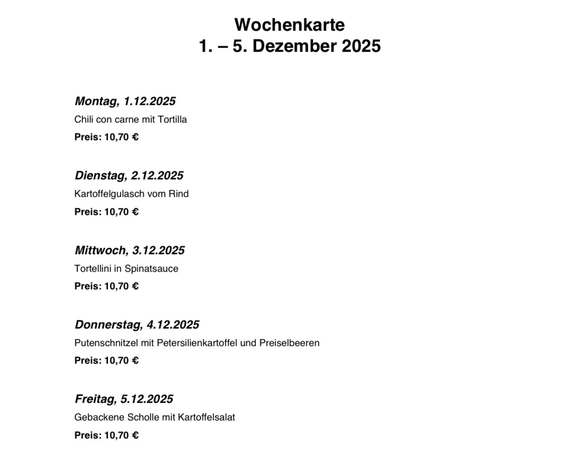 Aktuelles Wochenmenü von Michael Roth-Schmida - Sonntag, 30. November 2025, 18:59 Anzahl Antworten: 0 1.12. - 5.12. Dauerlink